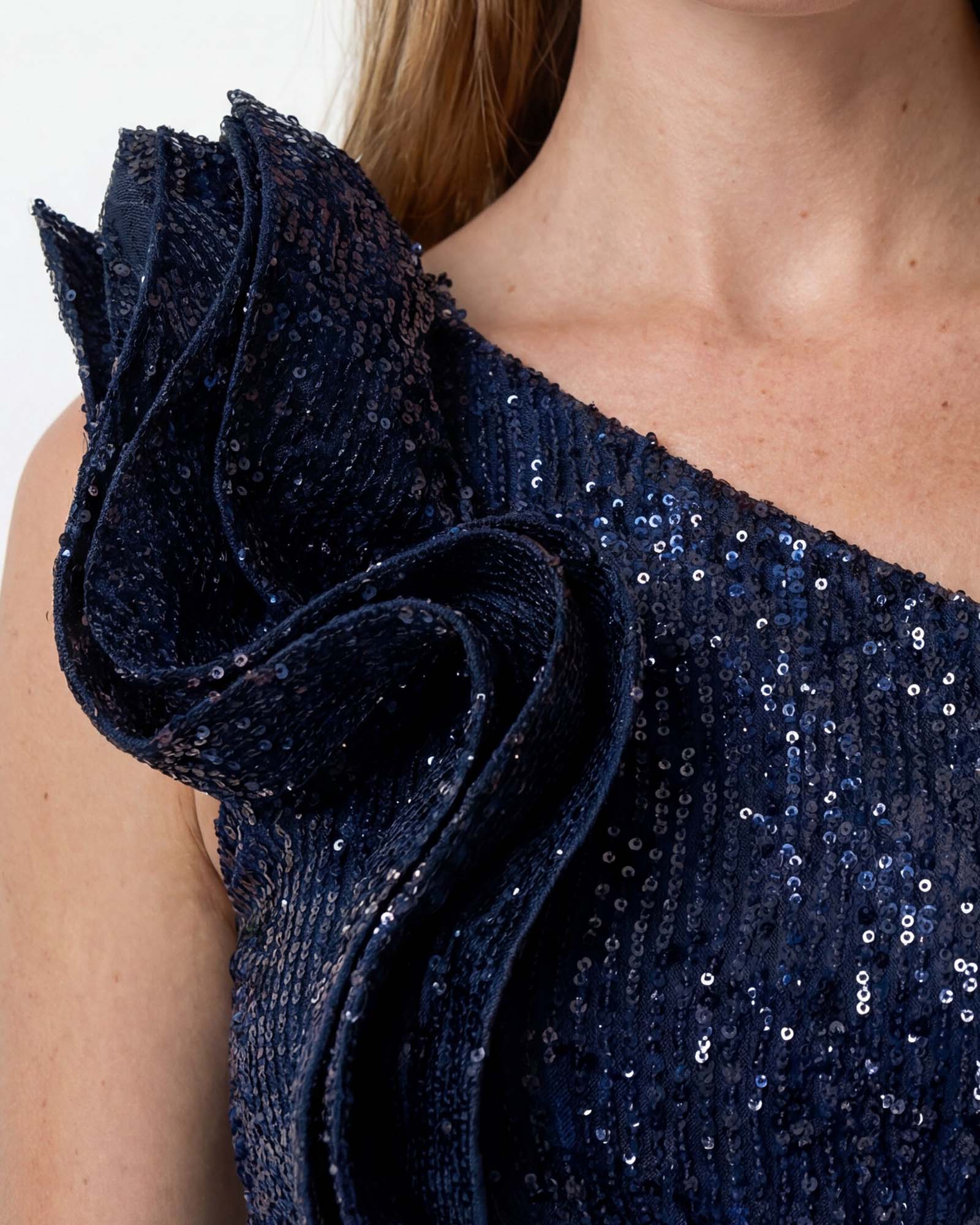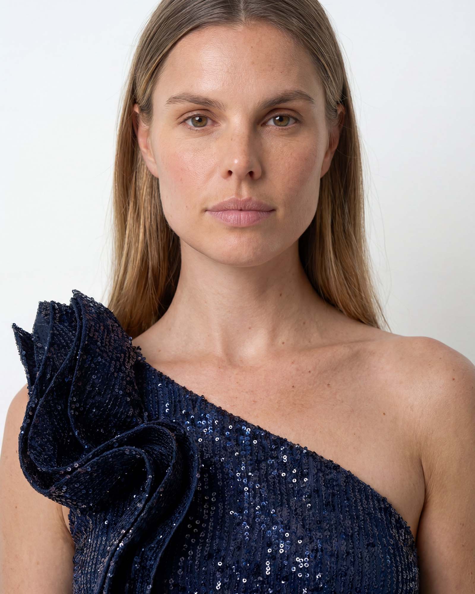 The ATHENA Dress brings together the deep, noble shimmer of navy sequin fabric with a modern, refined silhouette. Its light-catching sequin texture creates captivating movement from every angle, while the balanced cut reflects elegance and strength simultaneously.