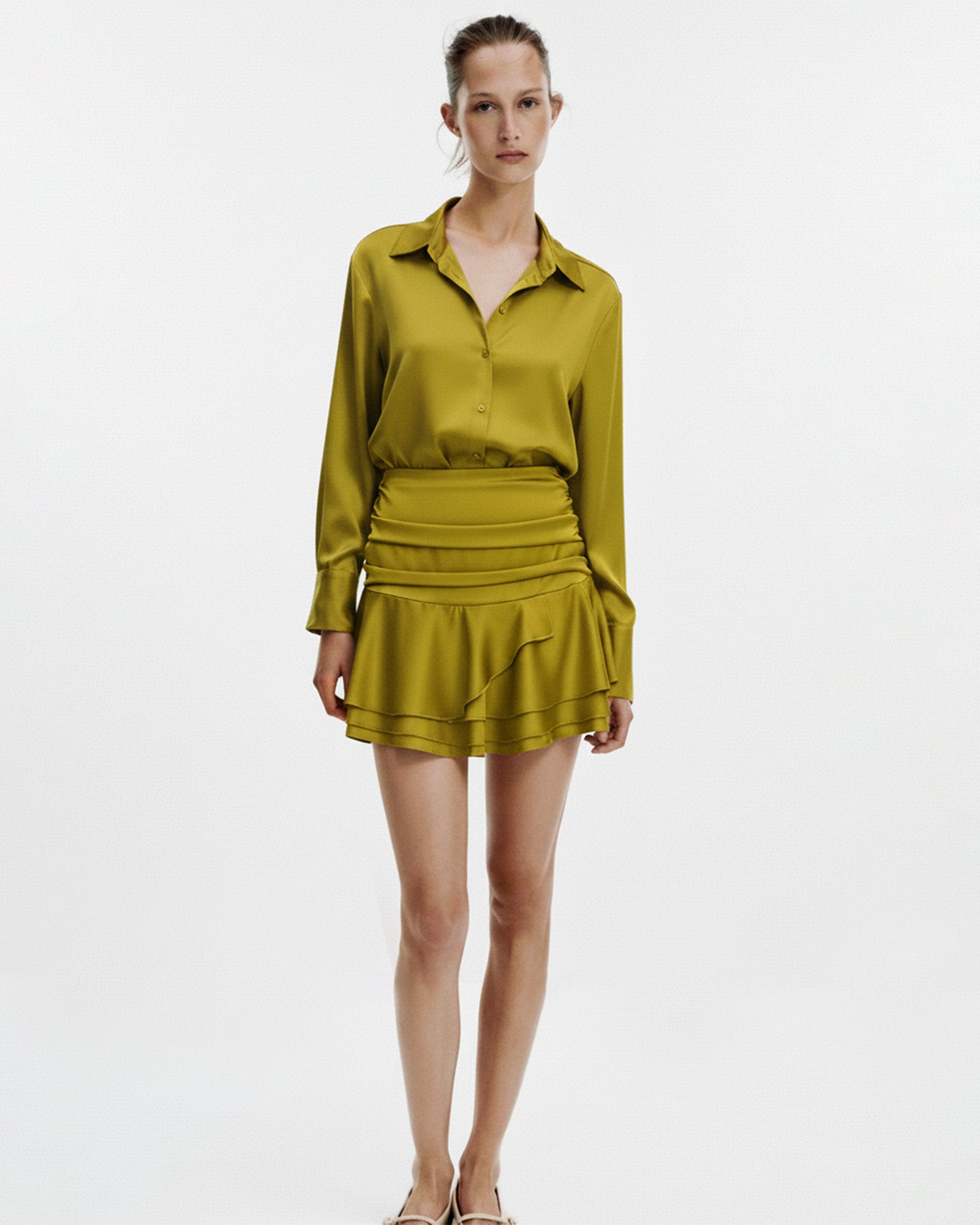 The soft sheen of the shirt adds a subtle glow, while the layered mini skirt brings playful movement and confidence.Perfect from day to evening — elegant, lively, and undeniably chic.