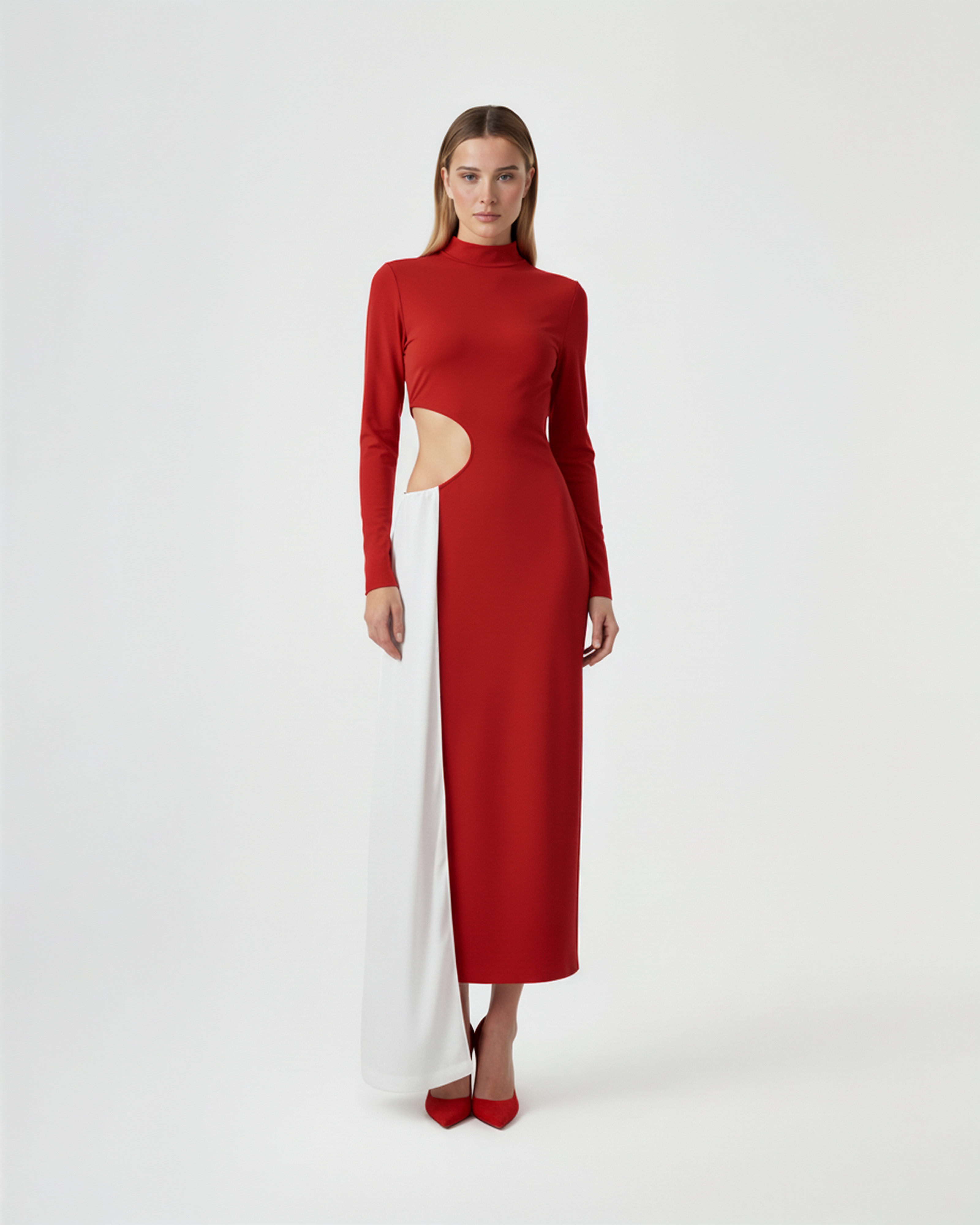 This Red-and-white maxi dress captivates with its body-hugging silhouette and dramatic cut-out detail. The high neckline and long sleeves create a sophisticated look, while the asymmetric cut at the waist and contrasting white panel add a bold, contemporary touch.