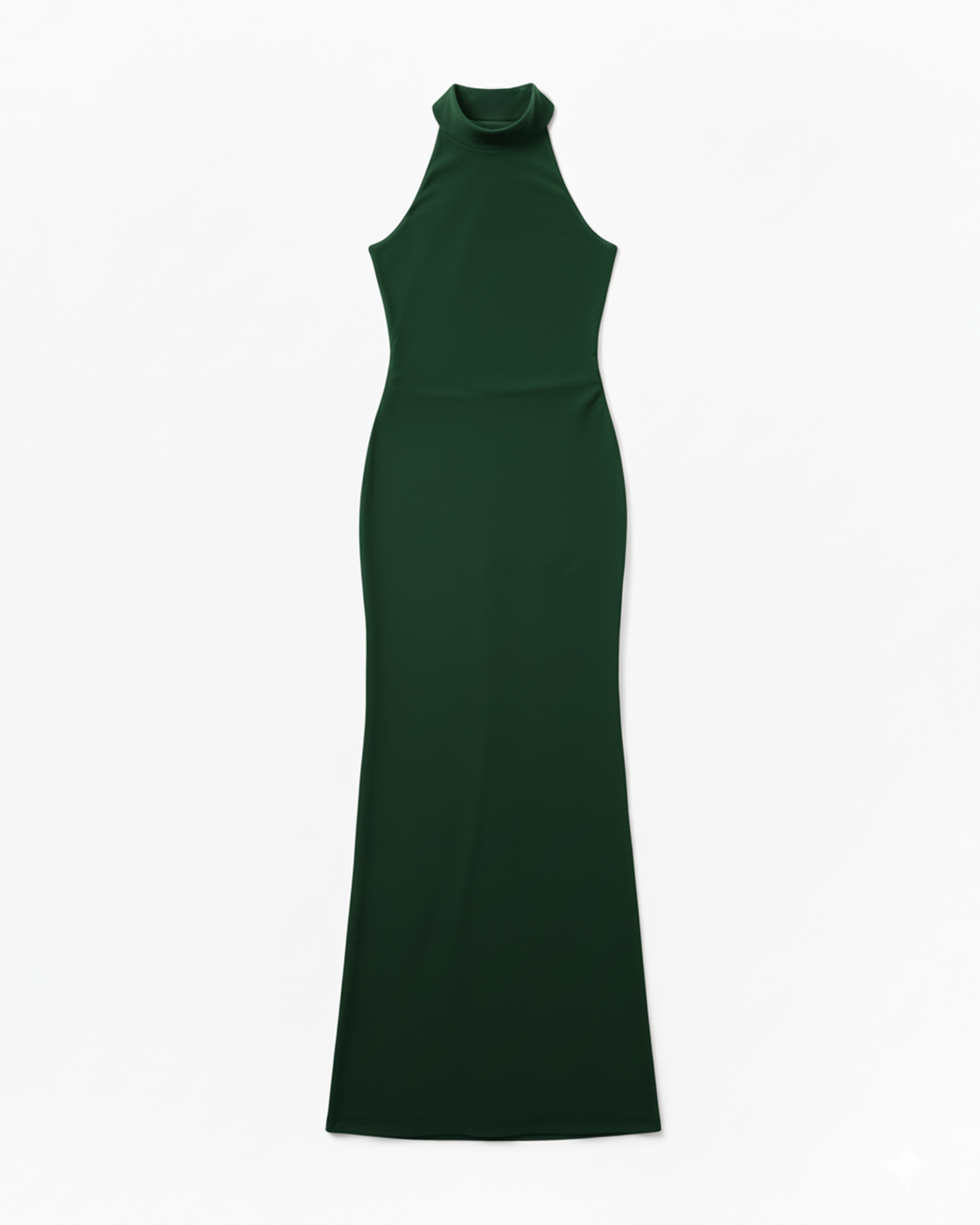 The NOCTURA Dress redefines sophistication with its high neckline, open-back design, and sculpted silhouette.