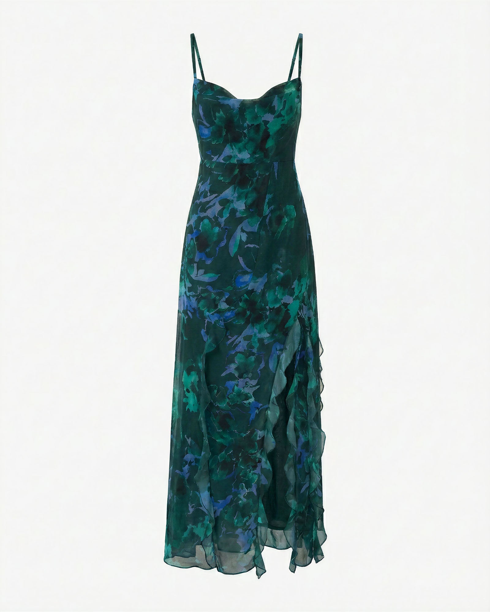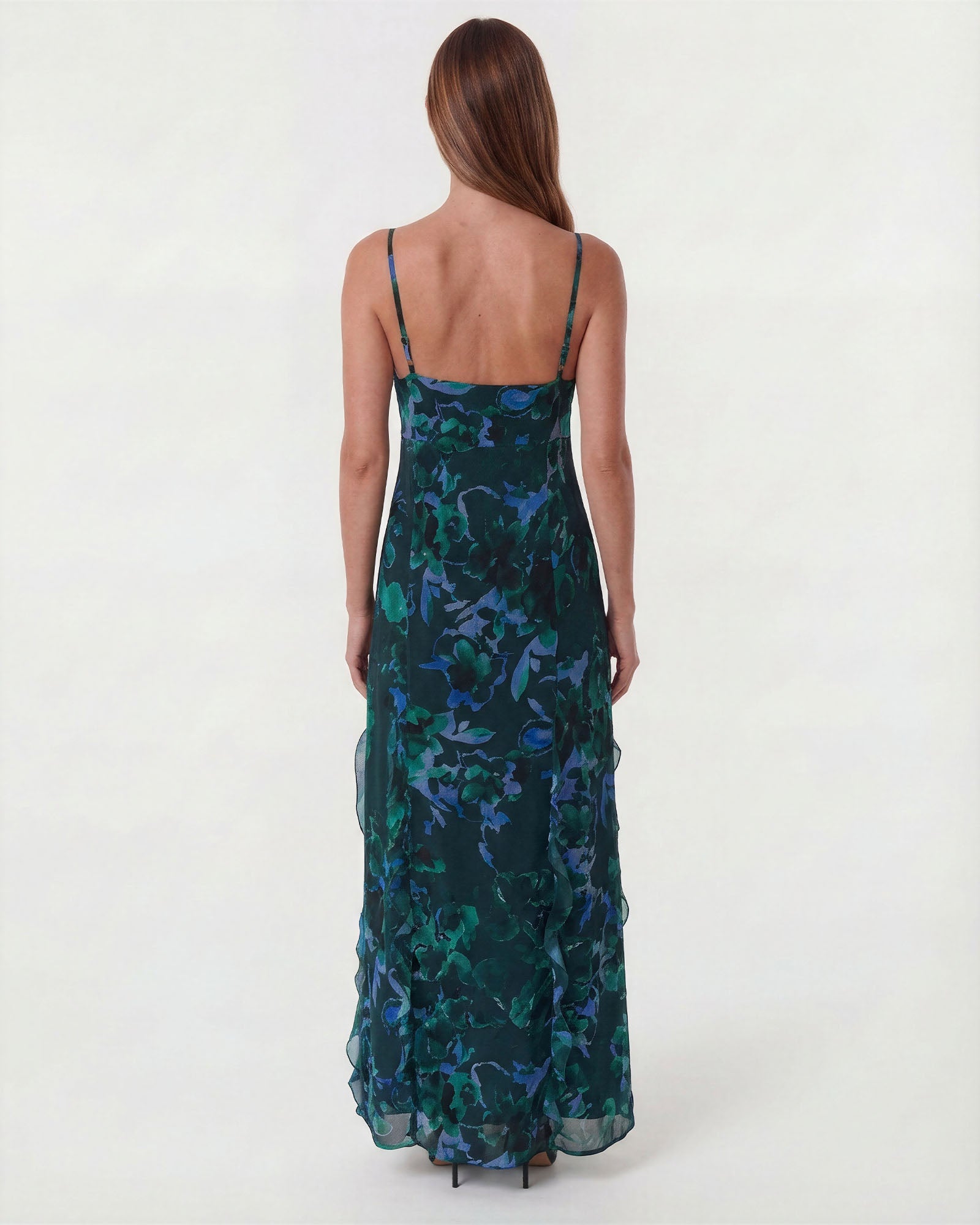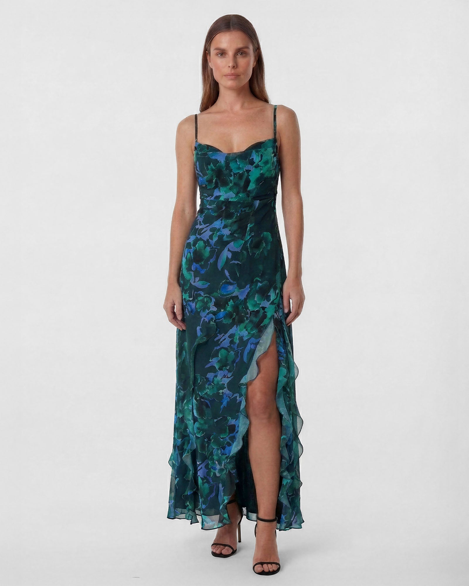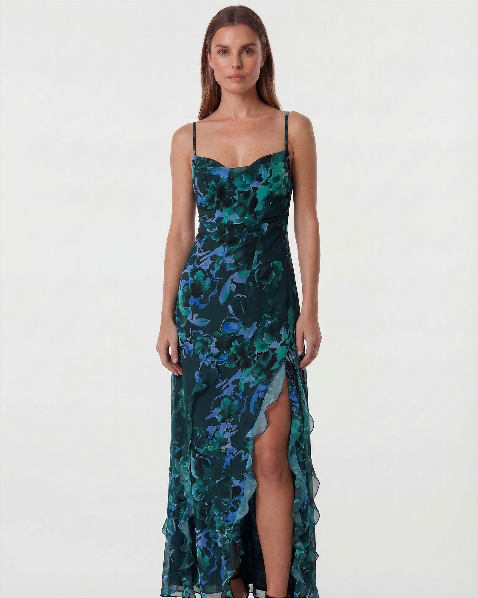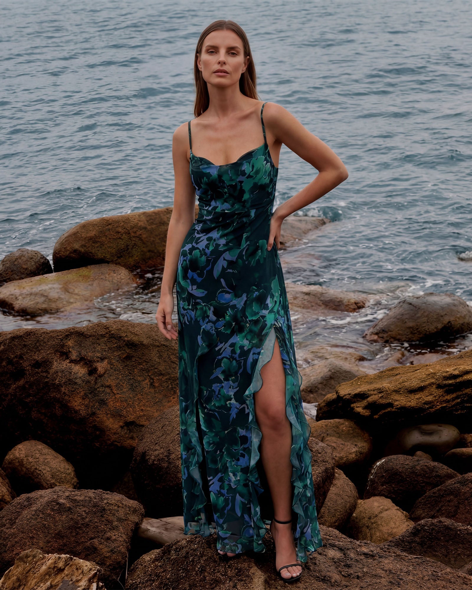 The ROSE Dress is a sophisticated design brought to life by the airy lightness of printed chiffon. Its delicate strappy bodice drapes elegantly over the body, while the side slit adds a modern and feminine touch.