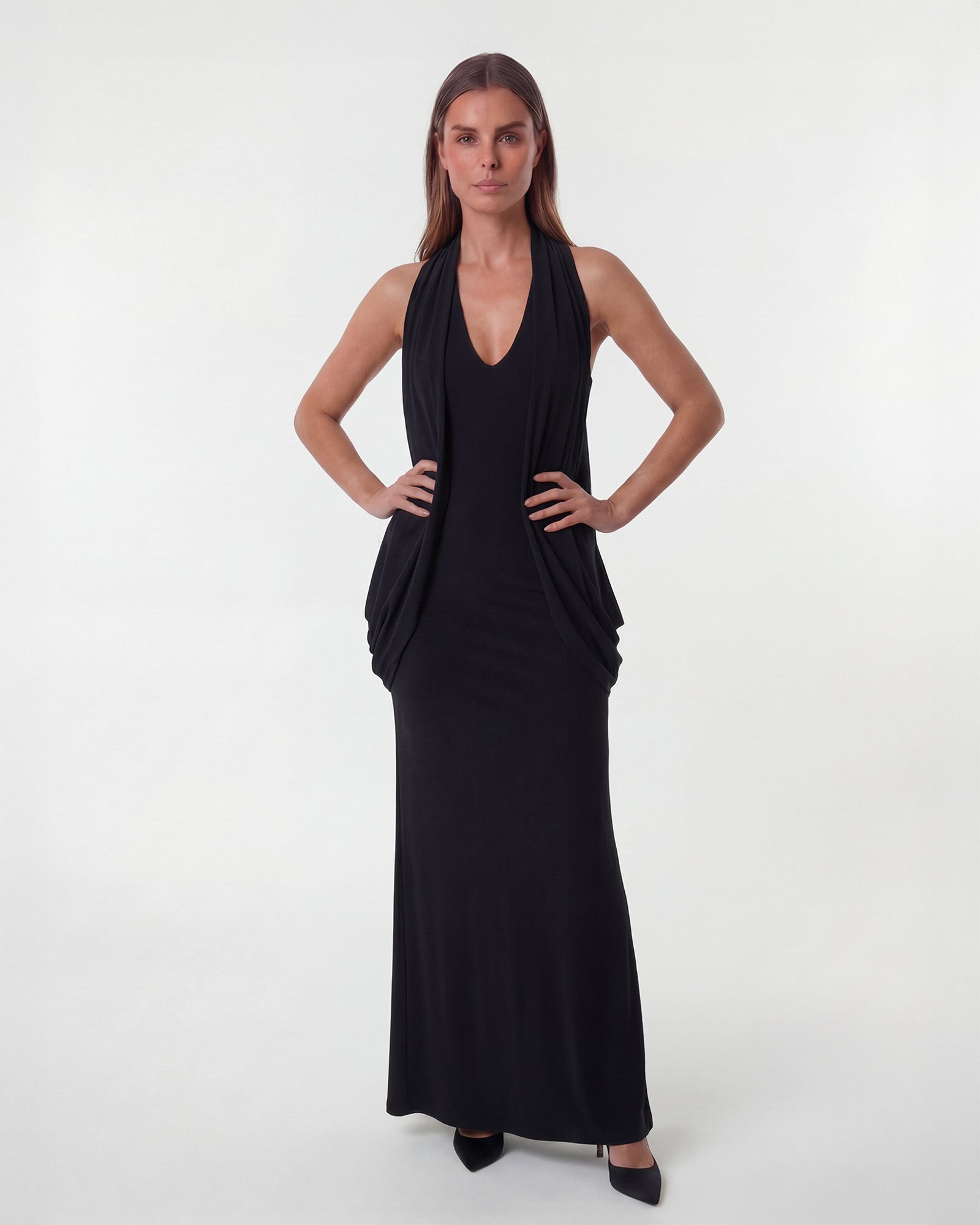 This black halter maxi dress is more than a design; it is movement, sculptural form, and confidence woven into fabric. A statement of elegance that lingers long after you leave the room.
