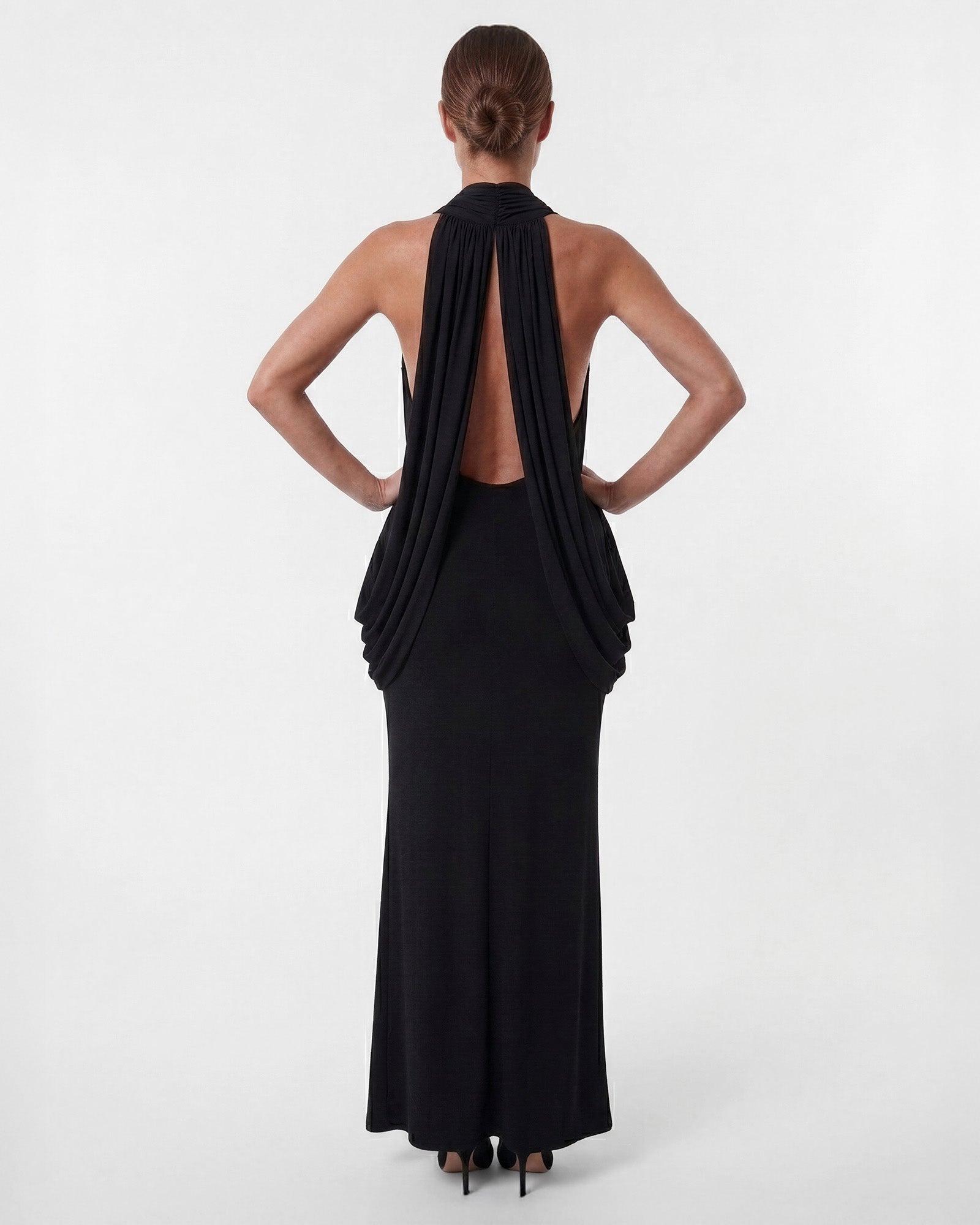 From both shoulders, circular draped accents fall fluidly from front to back, giving the design a sculptural dimension. These flowing drapes move gracefully with the body, adding depth and a striking character to the minimalist silhouette.