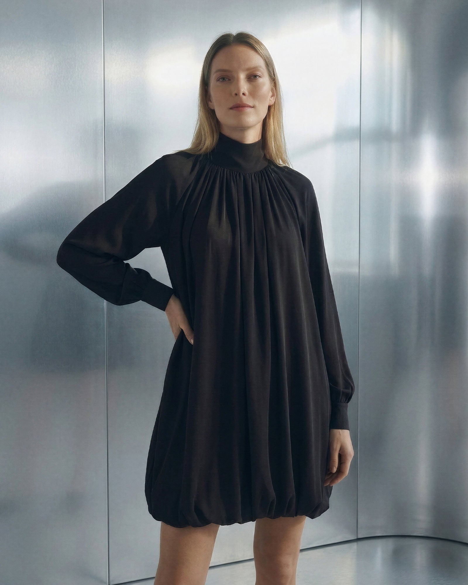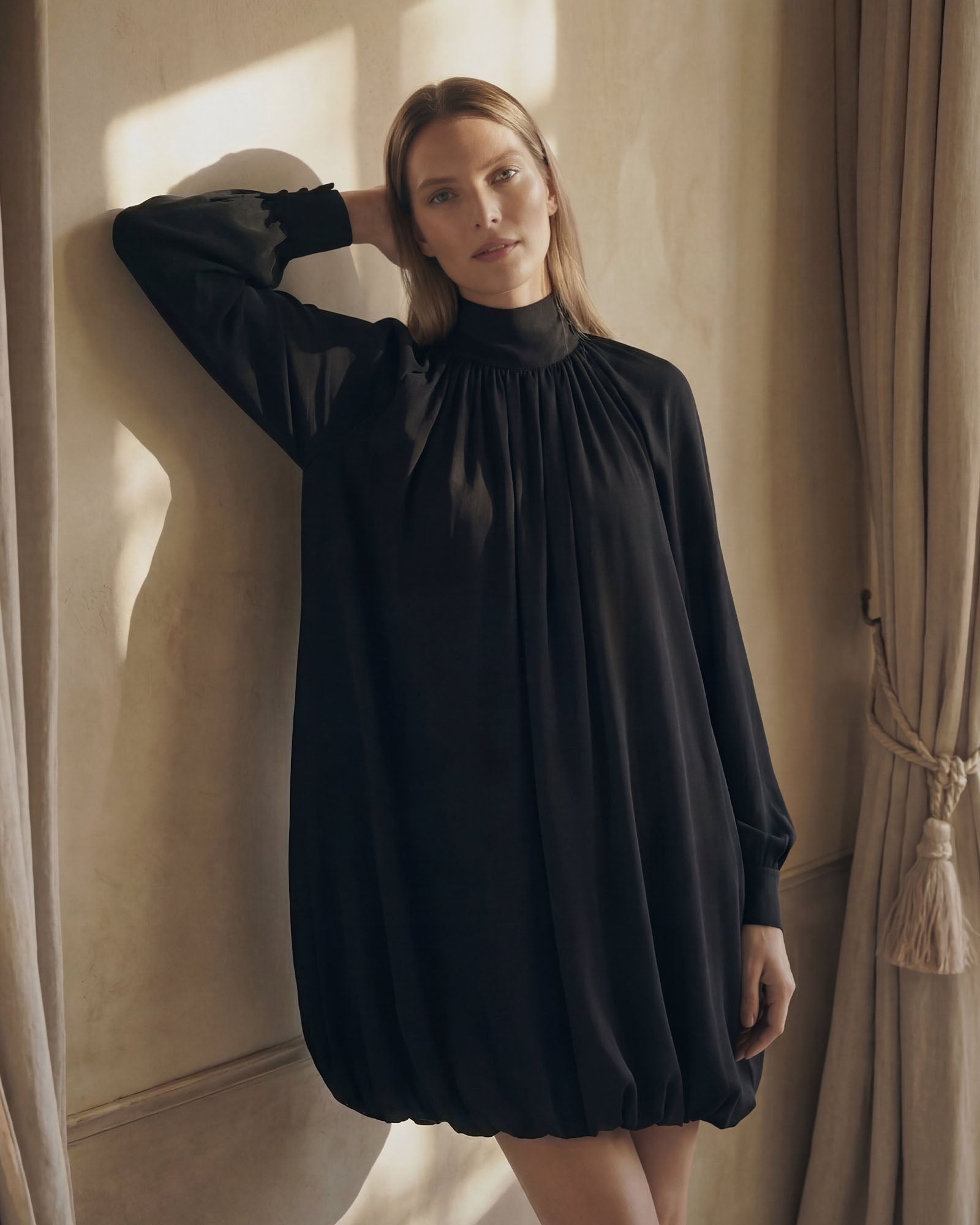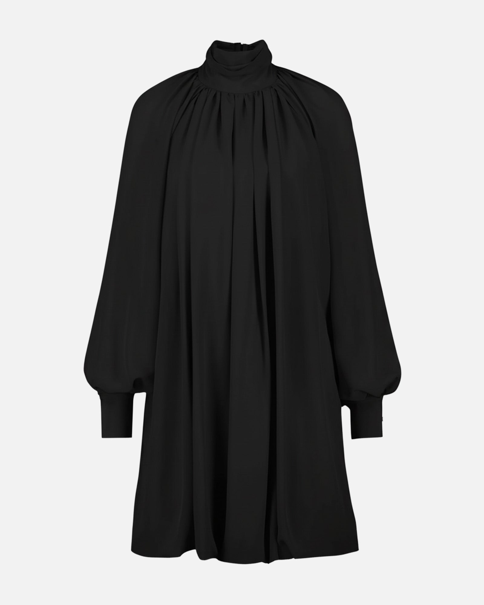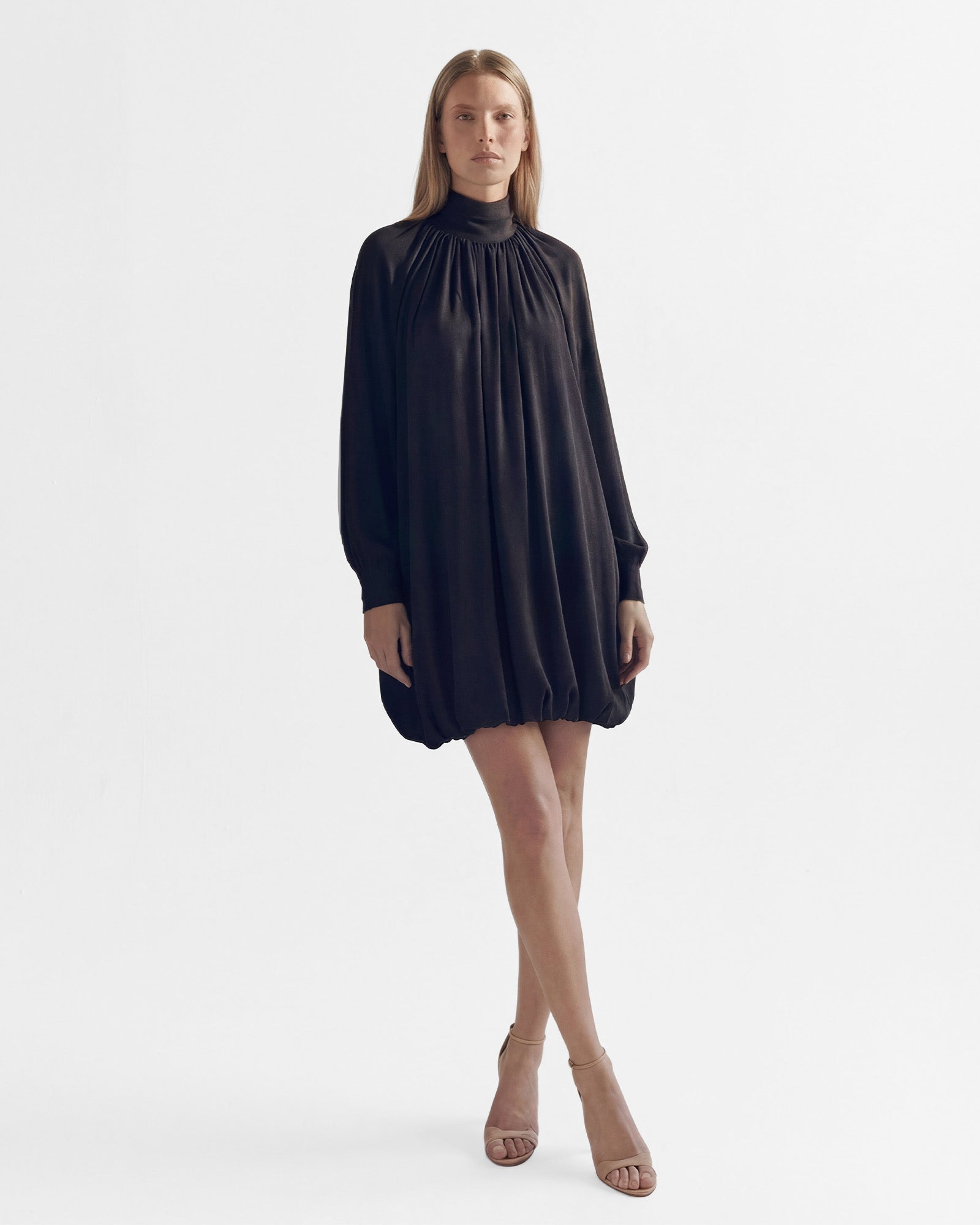 The ARVEN Dress features a draped neckline, long flowing sleeves, and a daring open back that adds intrigue to its minimalist silhouette.