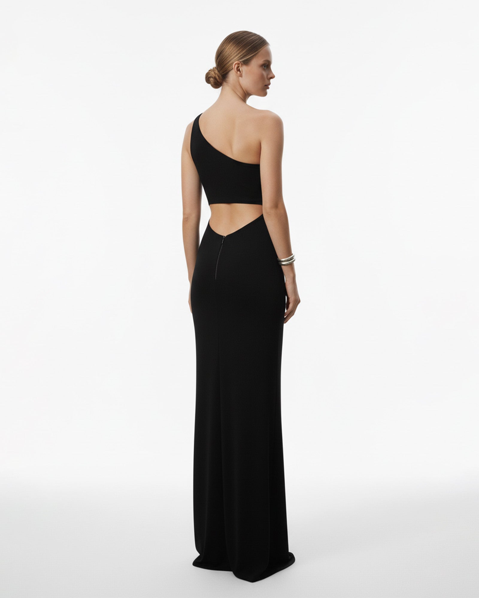 * Cut: One-shoulder, fitted maxi silhouette