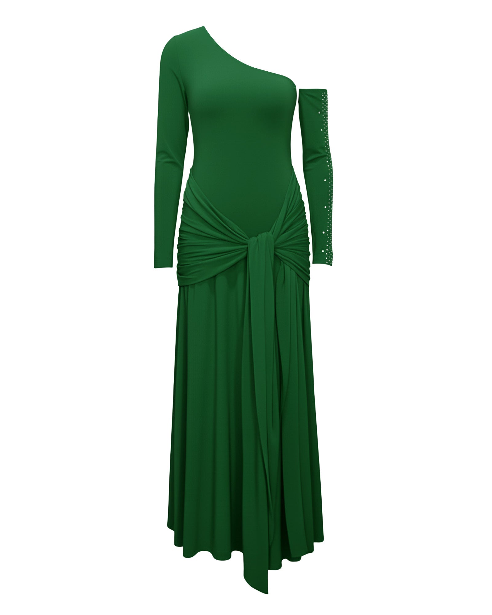 * Cut: One-shoulder with long crystal sleeve and knotted waist