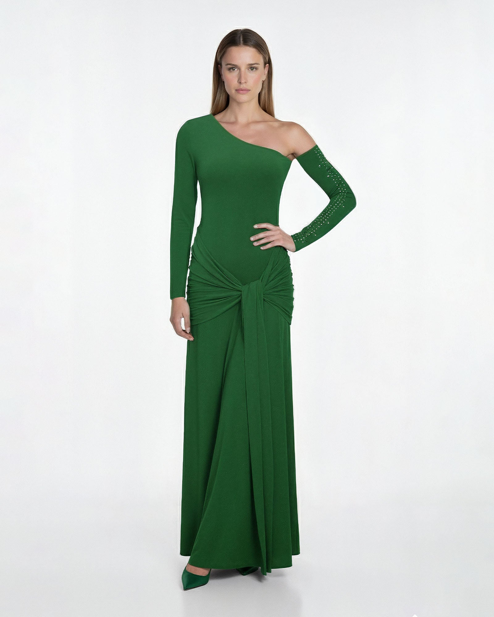 The SERAPHA Dress embodies modern goddess allure with its one-shoulder silhouette, crystal-embellished sleeve, and sculptural knot detail at the waist.