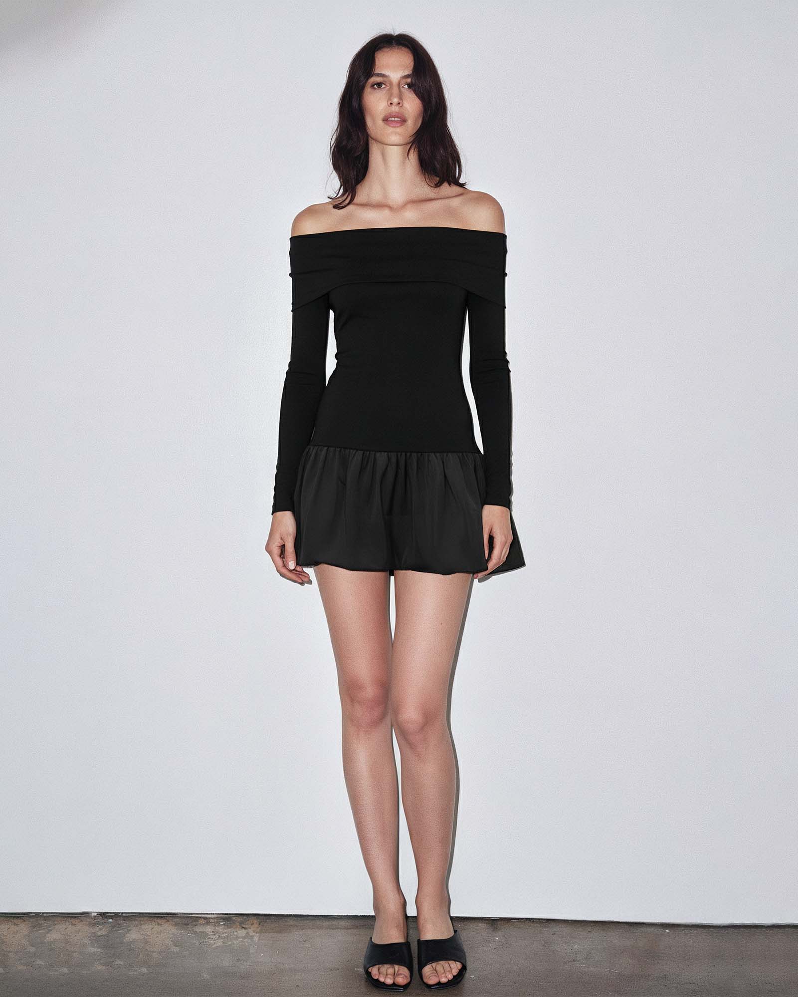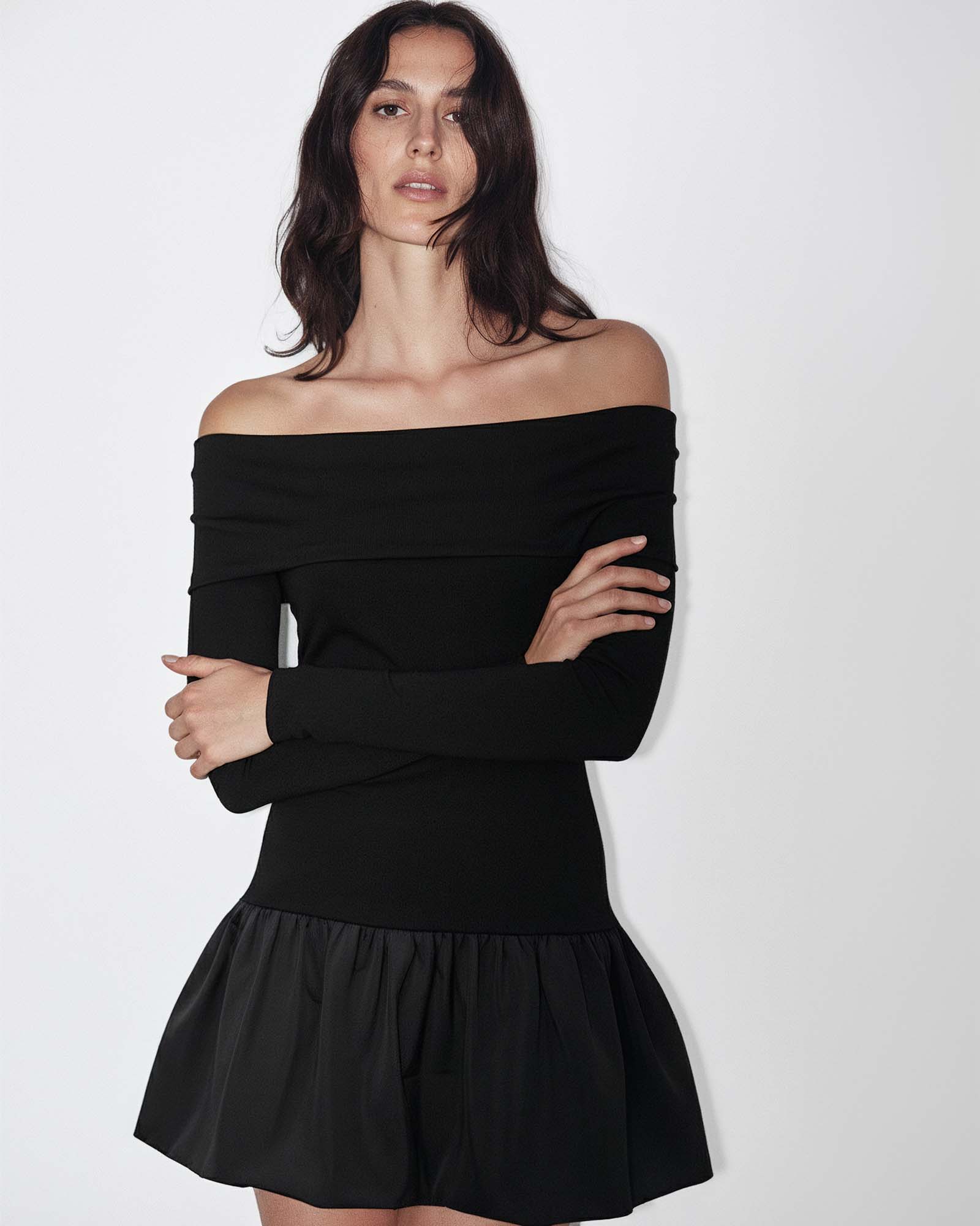 Omuz açık yaka ve uzun kollar, feminen çekiciliğini artırırken modern bir dokunuş katıyor.