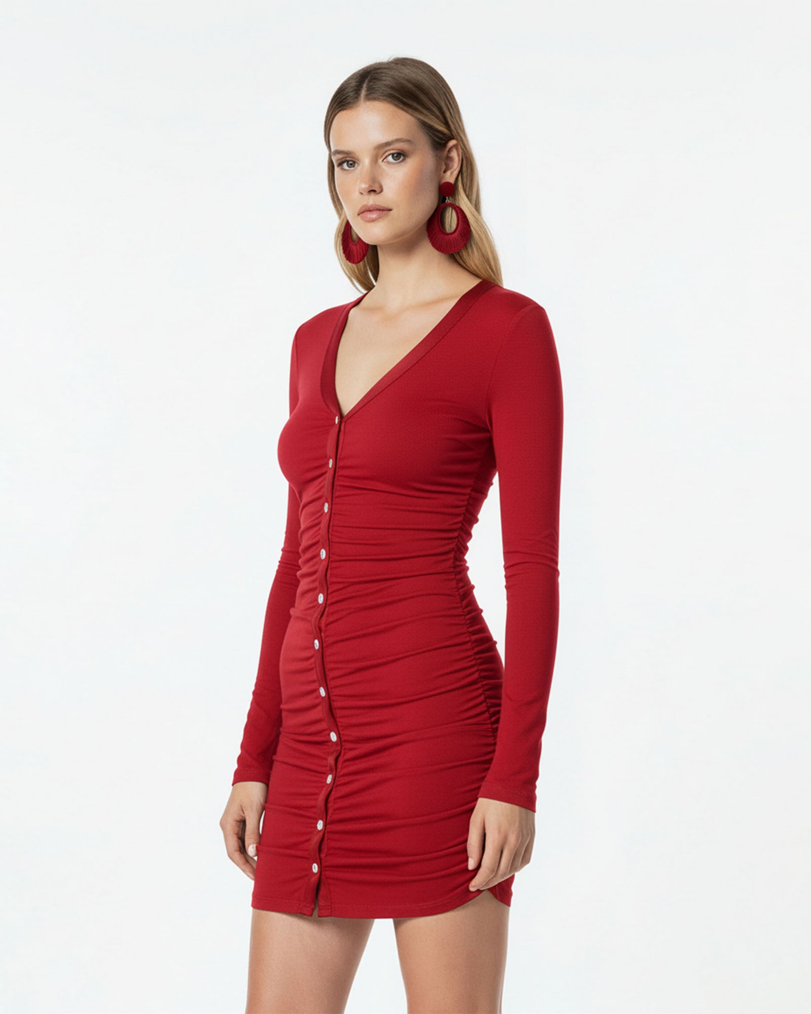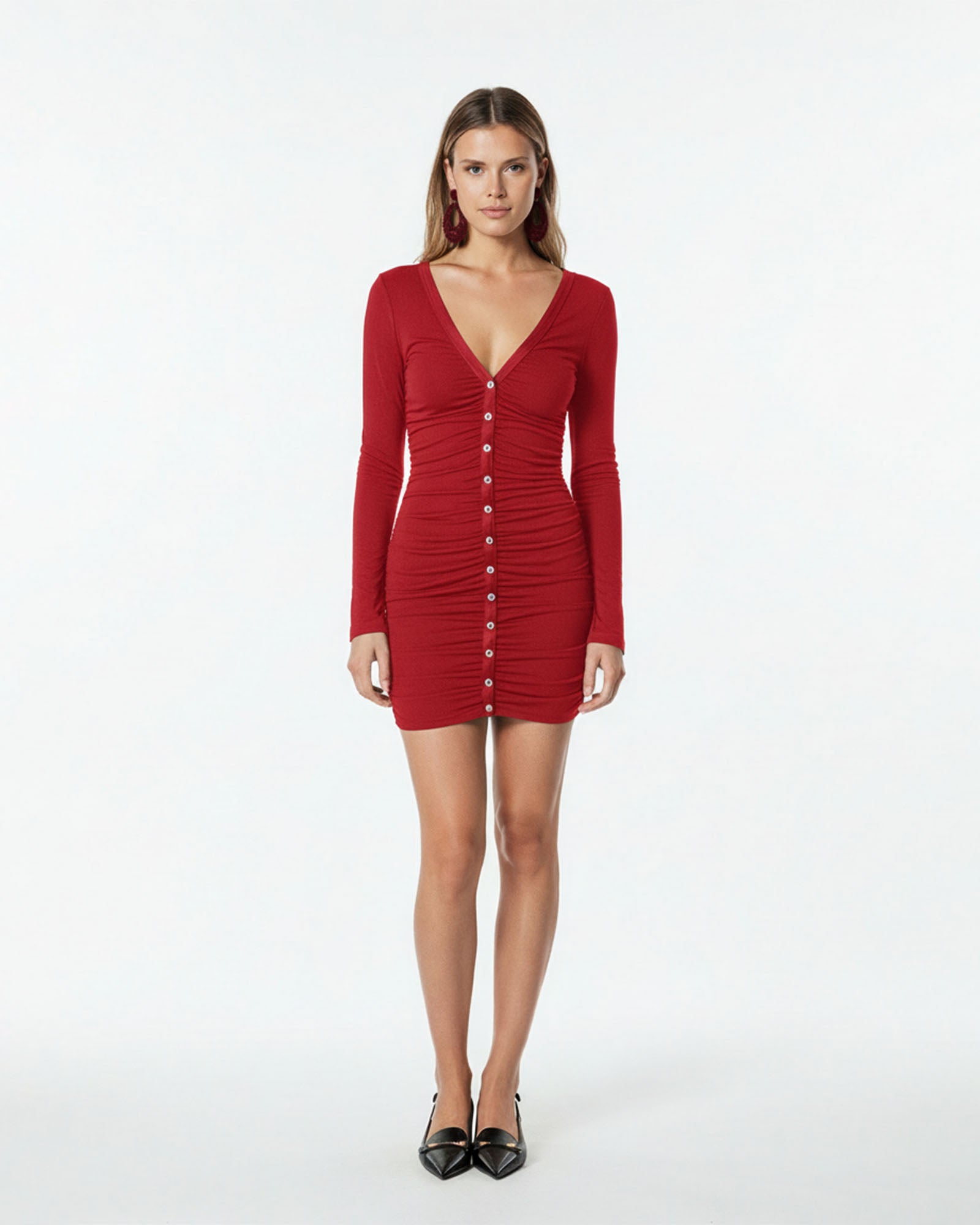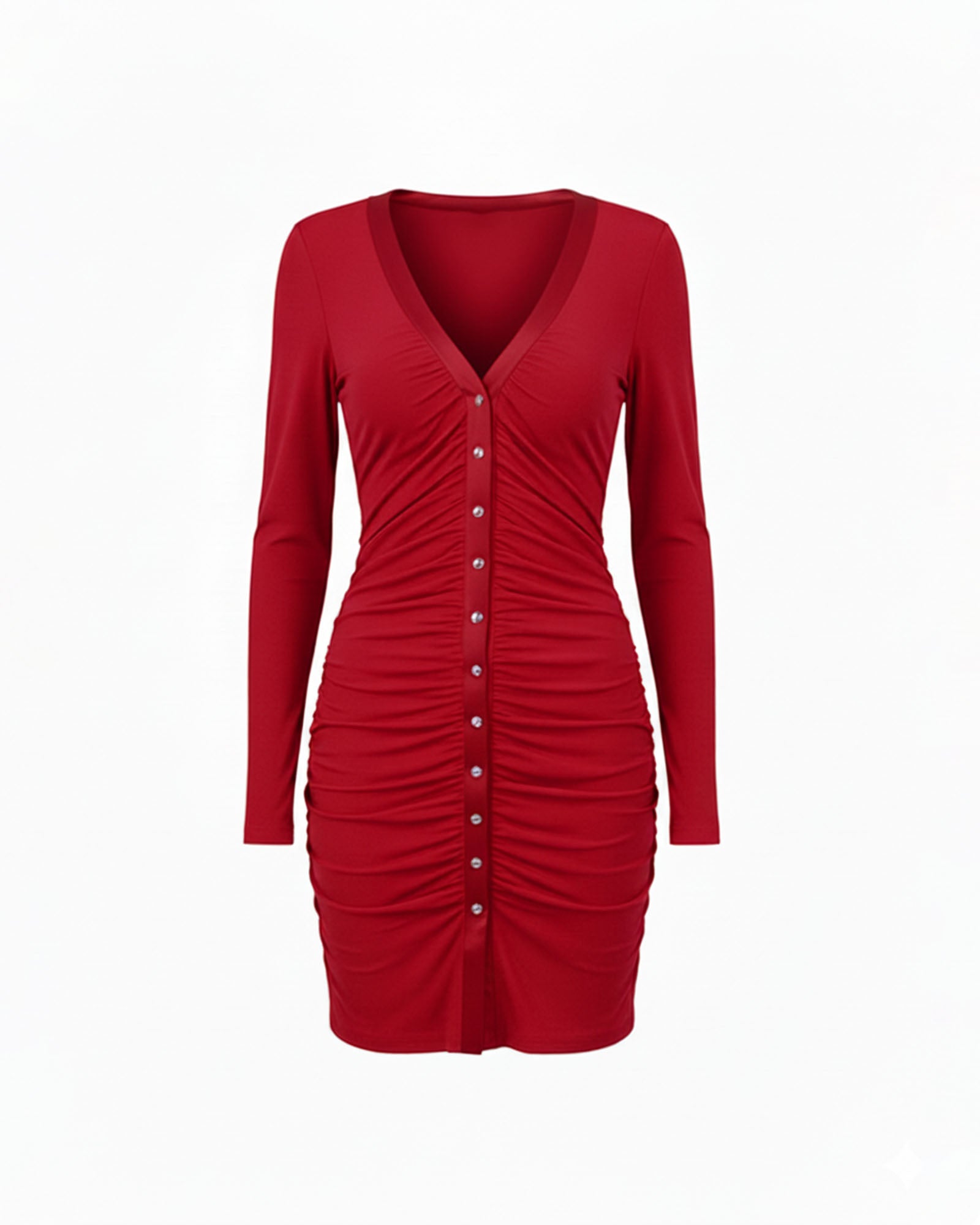 ARLENA Elbisesi, derin V yaka, önden düğme kapanış ve zarif büzgü detaylarıyla vücudu zahmetsiz bir şıklıkla öne çıkarır.