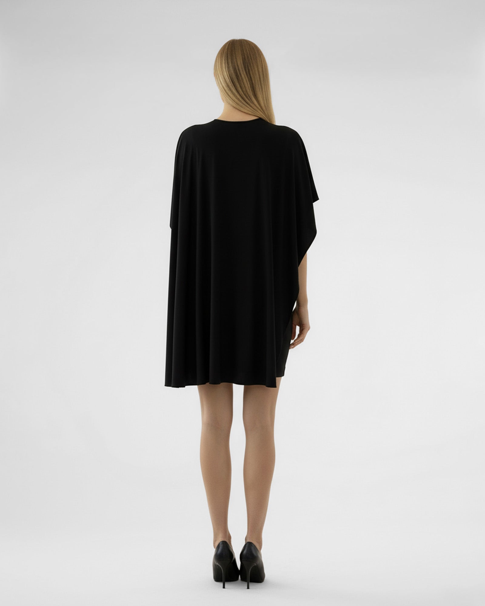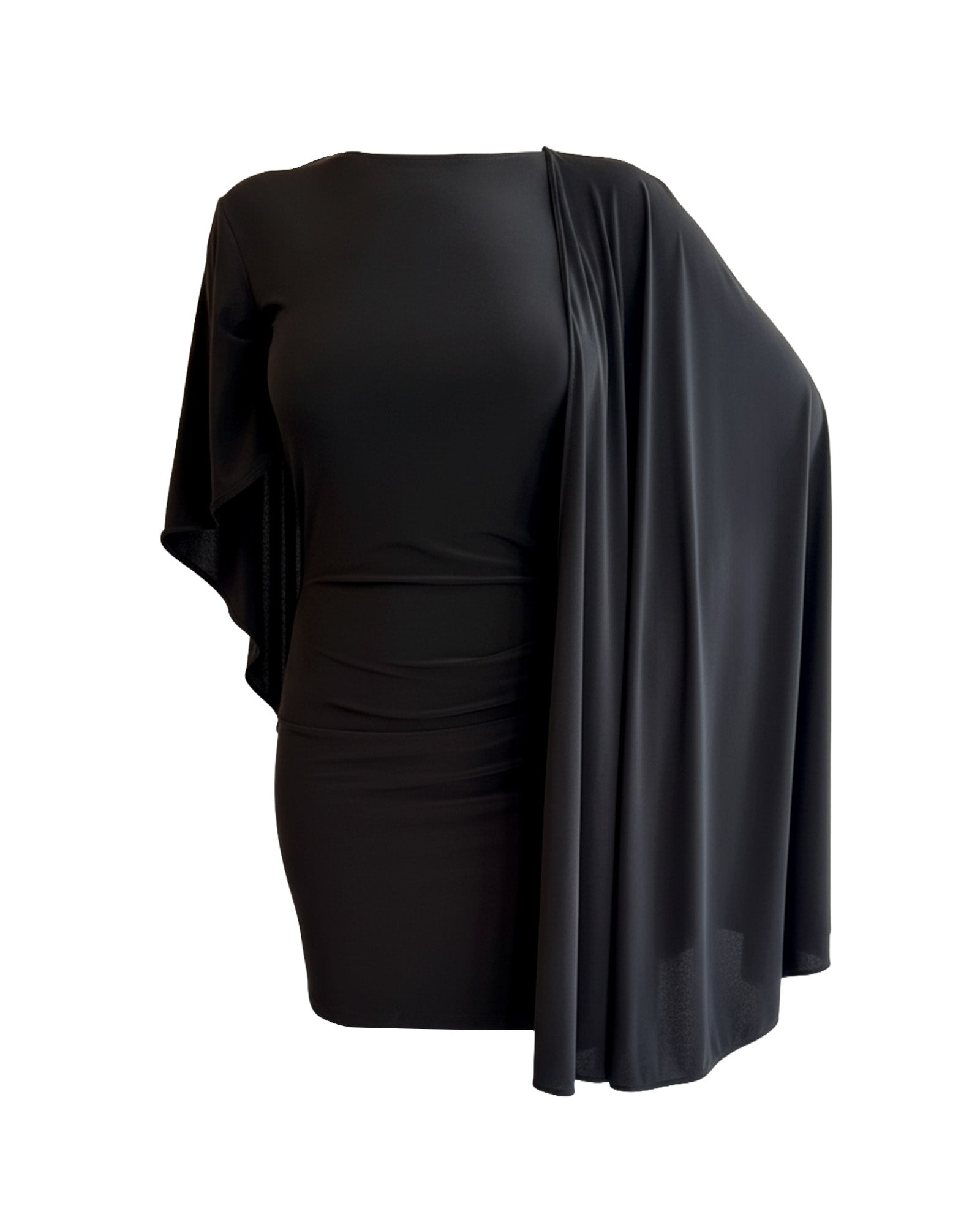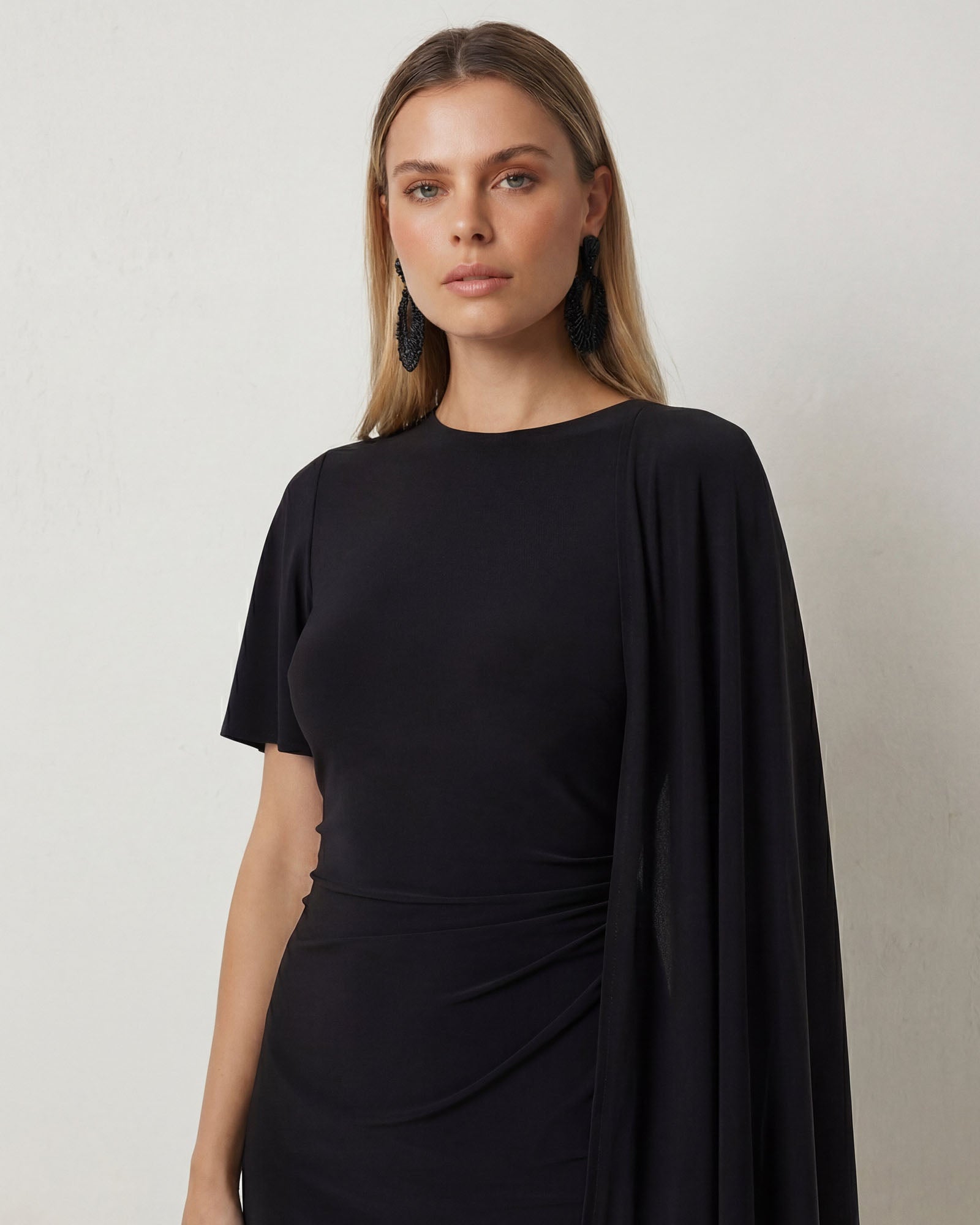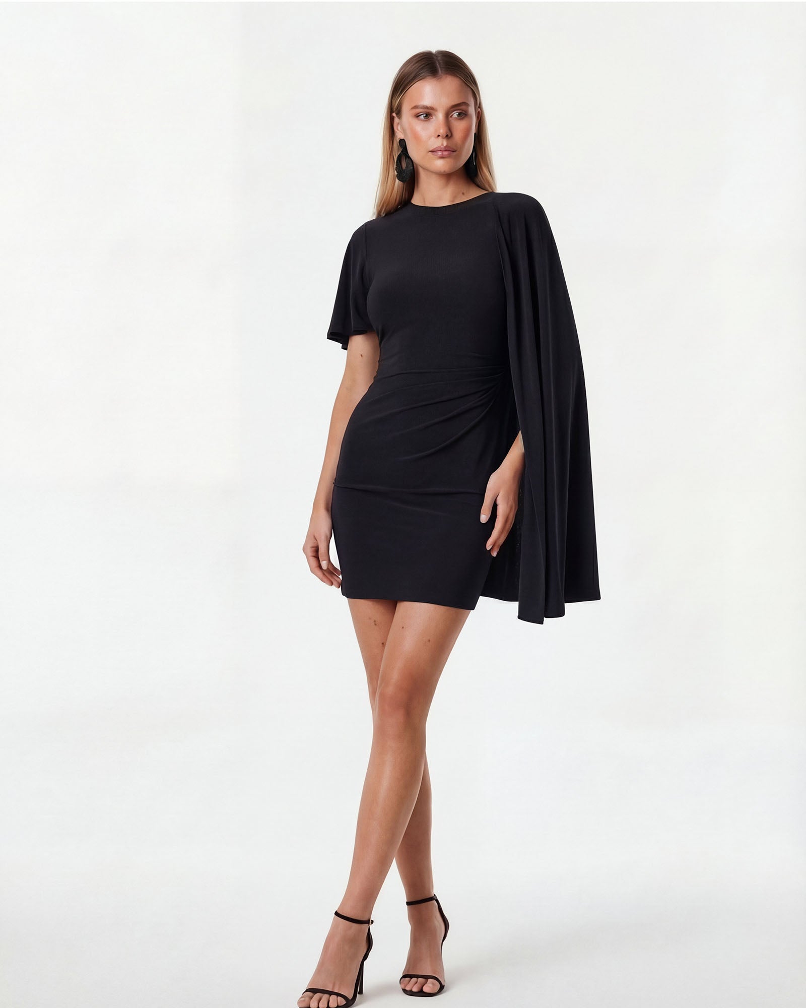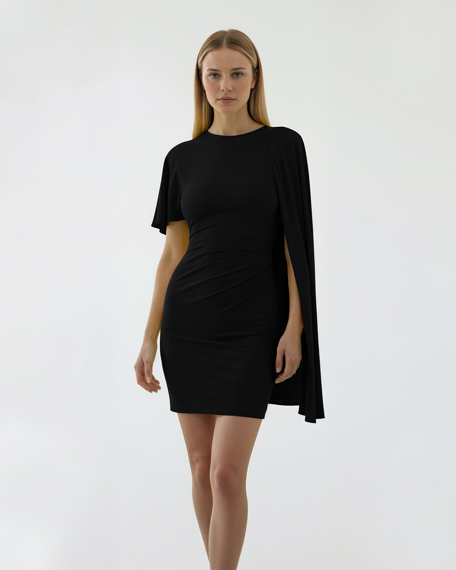 AURORA Elbise, vücudu saran esnek sandy kumaşı ve akışkan pelerin detayı ile güçlü ama zarif bir silüet yaratıyor.