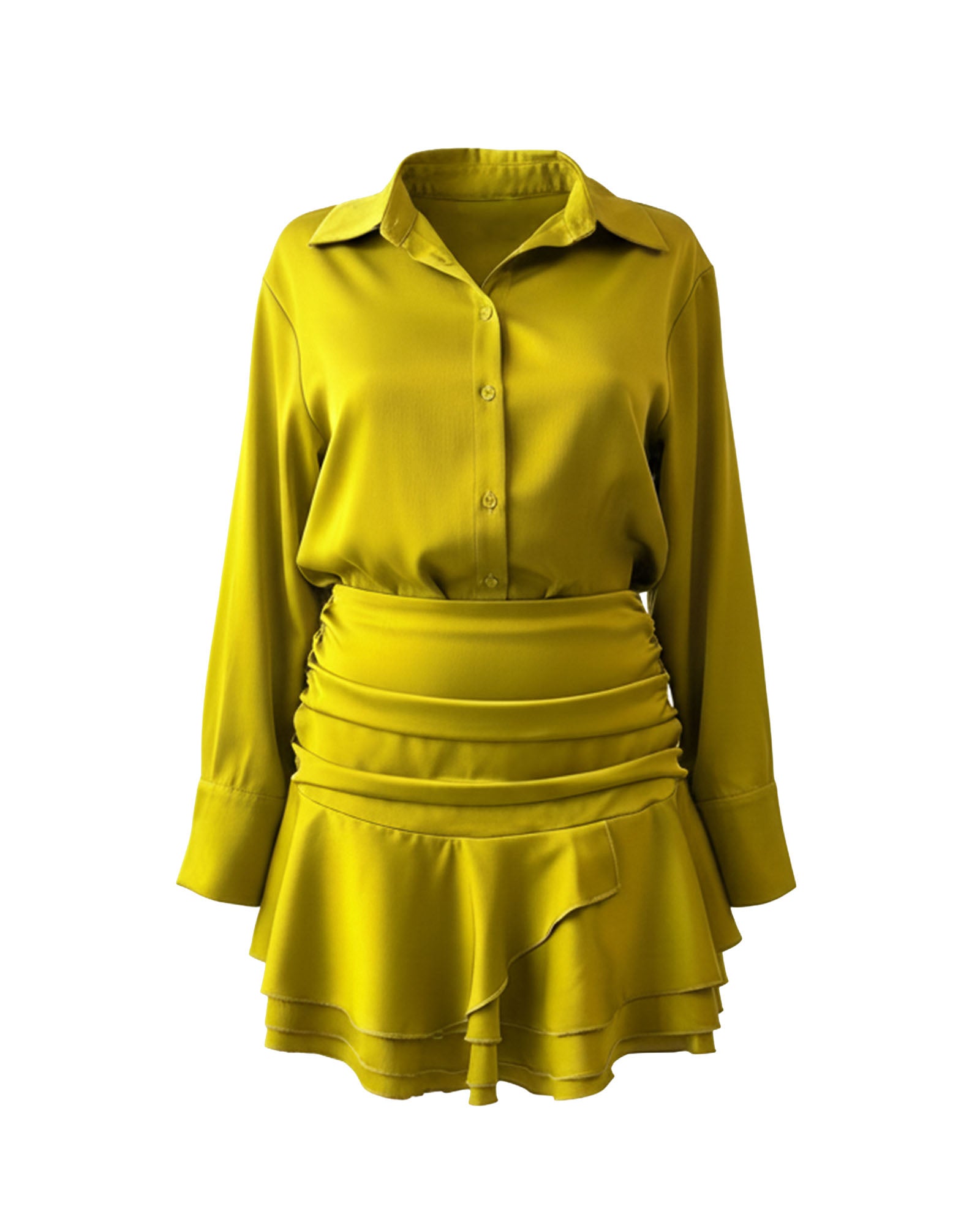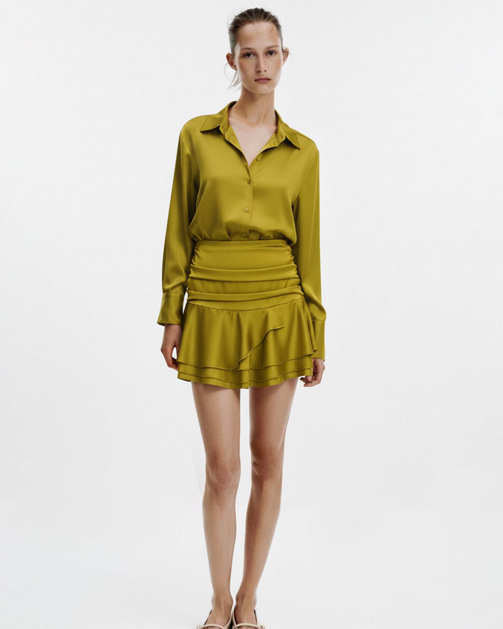 * İçerik: Uzun kollu saten gömlek + katlı mini etek