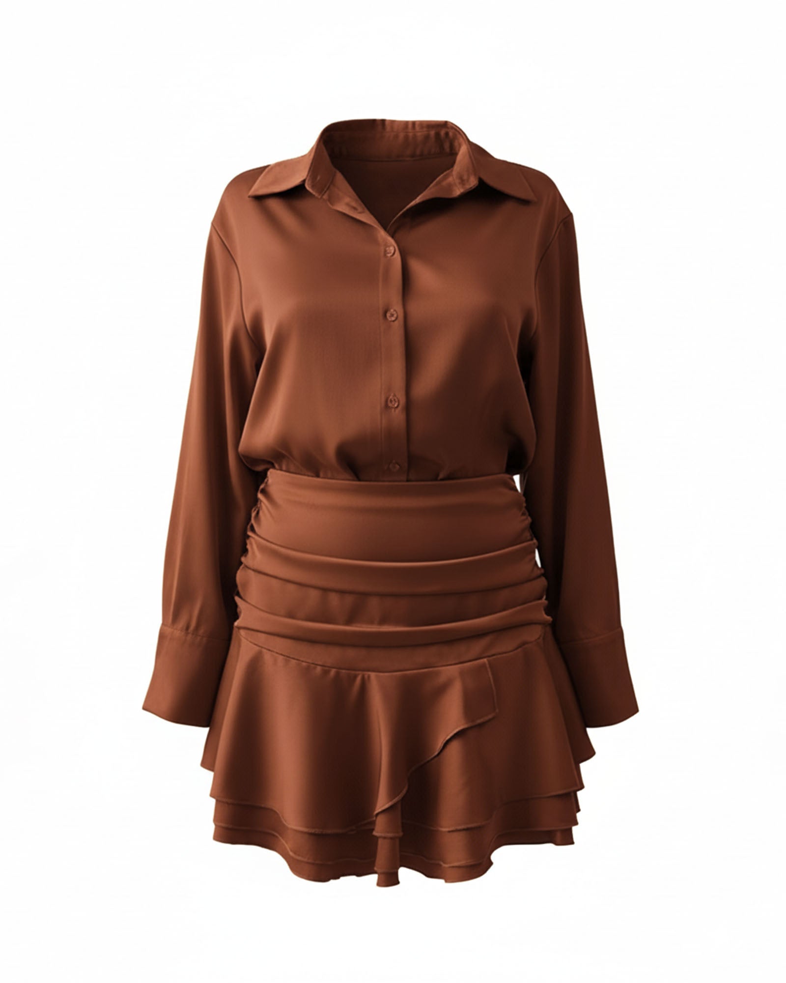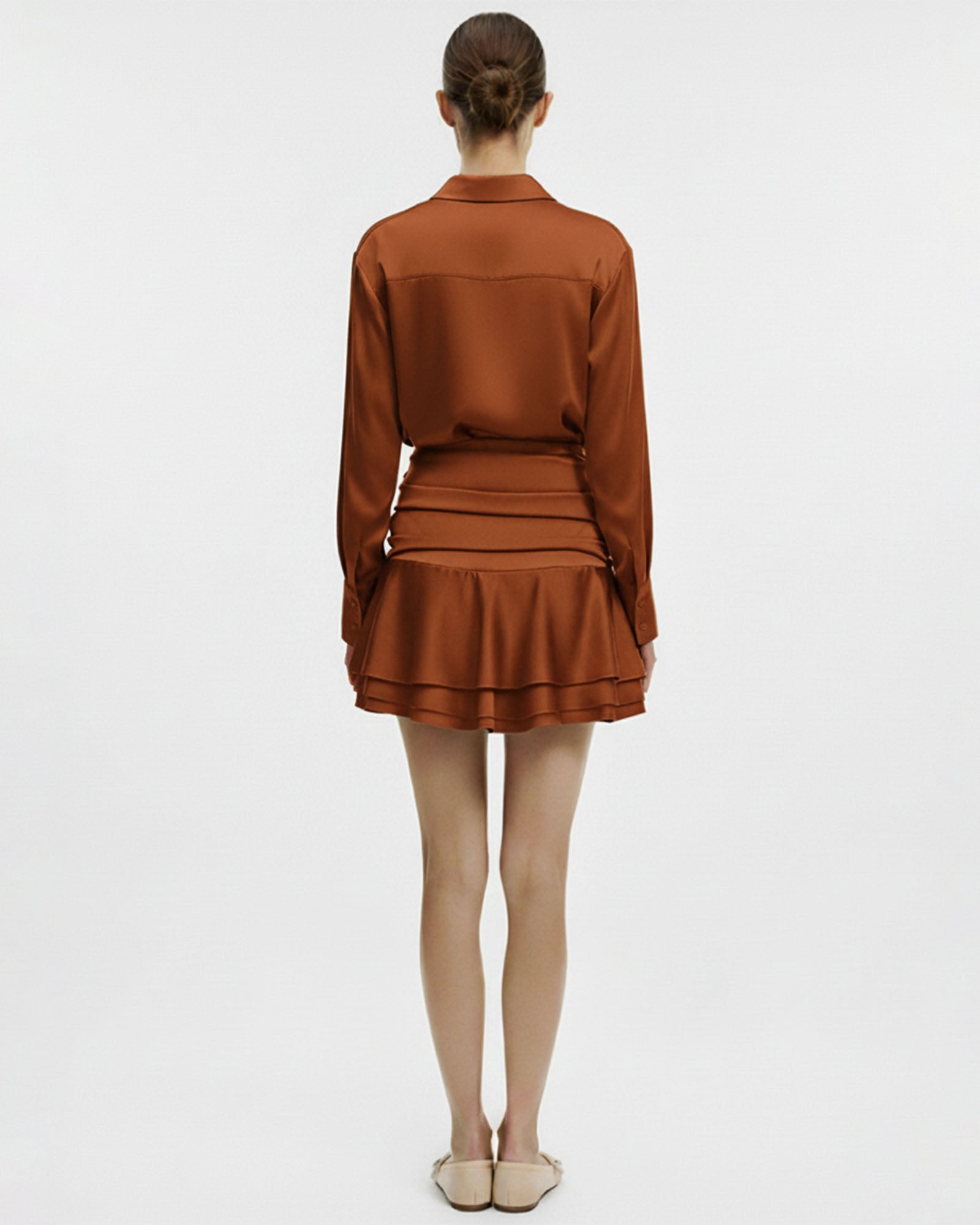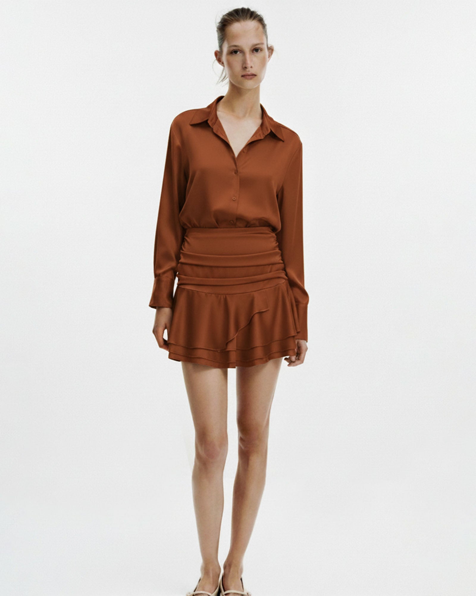 * İçerik: Uzun kollu saten gömlek + katlı mini etek