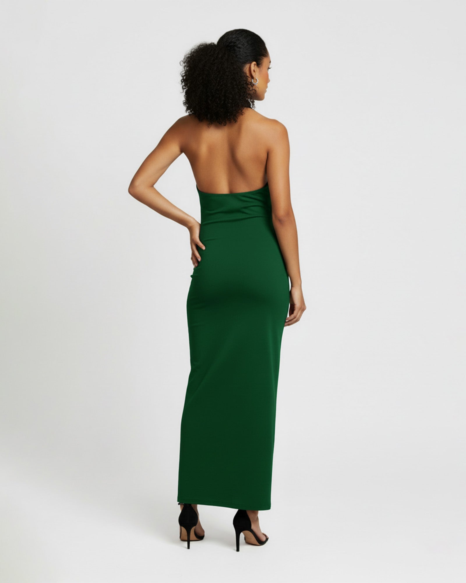 NOCTURA Elbisesi, yüksek yakası, açık sırt detayı ve heykelsi siluetiyle sofistikasyonu yeniden tanımlıyor.