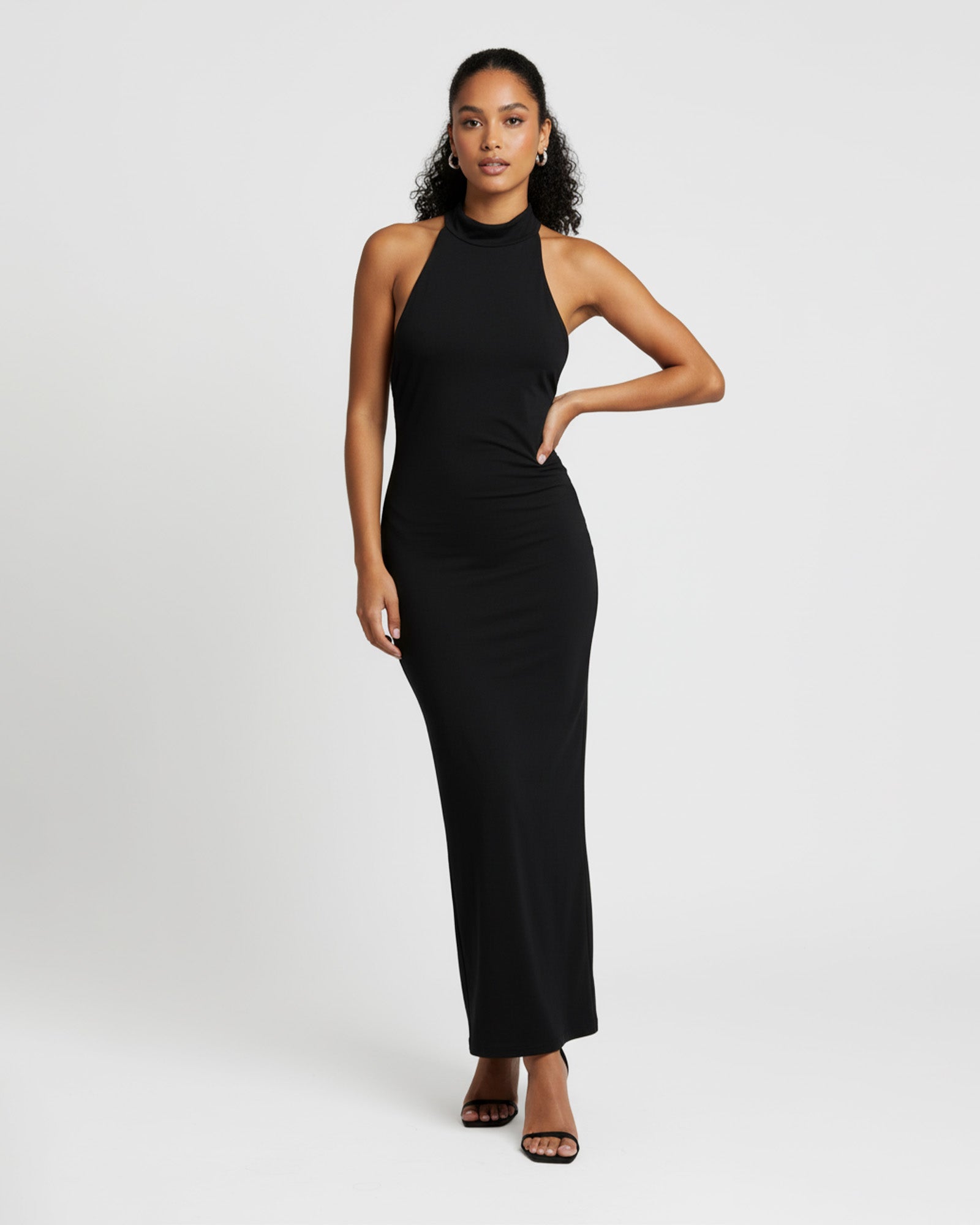 Lüks, esnek sandy kumaştan üretilen elbise, vücudu zarifçe sararken, minimal çizgilerle güç ve zarafeti dengeliyor.