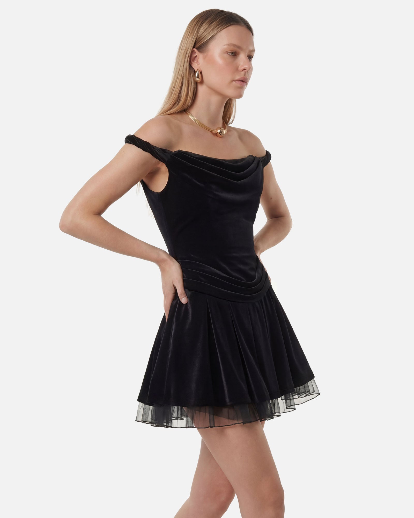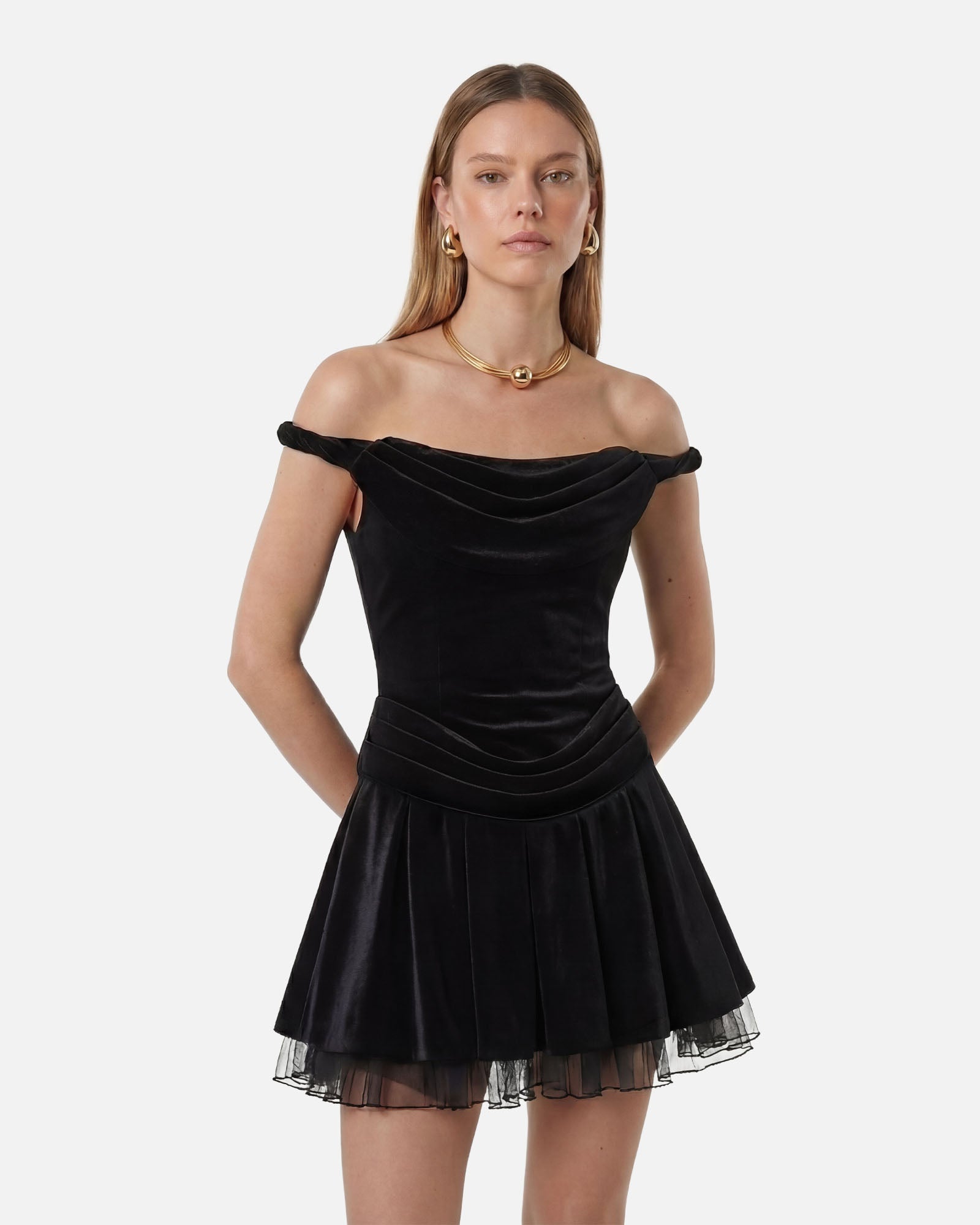 EOS Dress, siyah kadifenin asil derinliğini etek ucundaki narin tül detayıyla bir araya getirerek, dokuların incelikli bir uyumunu yaratıyor. Kayık yakası omuzları zarif bir şekilde vurgularken, mini çocuk silüeti modern ve aynı zamanda feminen bir görünüm sunuyor.