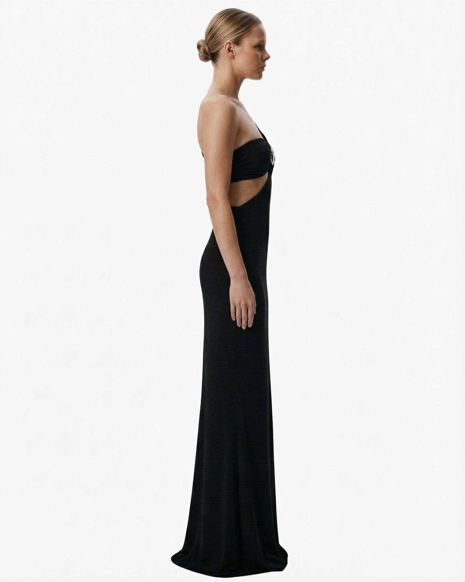 The HELIA Dress vücuda oturan esnek siyah kumaşı ve beldeki imza niteliğindeki altın madalyon detayıyla güç ve çekiciliği bir arada sunar.