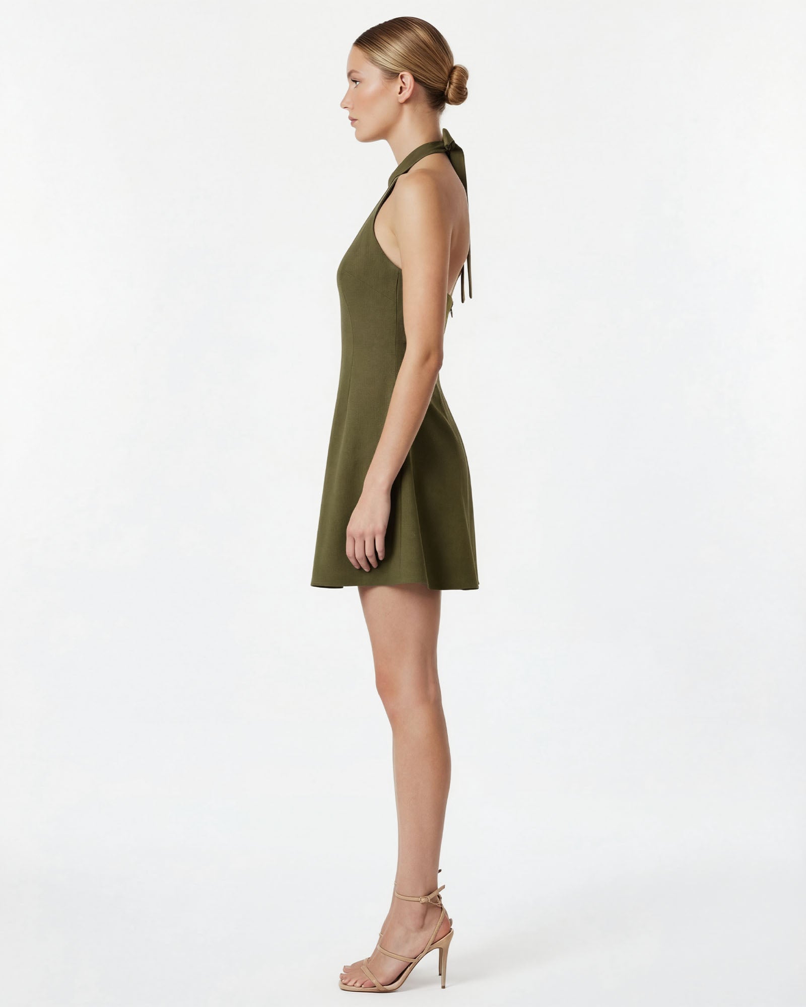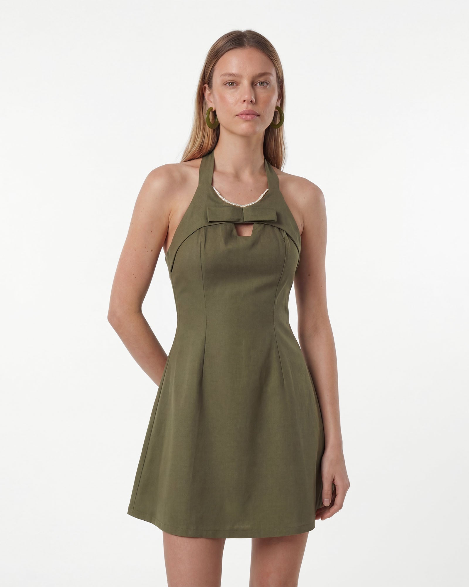 The VIVI Elbise halter yaka kesimi, gövdedeki zarif fiyonk detayı ve hacimli çan formundaki eteğiyle feminen bir silüeti eğlenceli bir dokunuşla buluşturur. Göğüs üstündeki zarif pencere detayı modern bir çekicilik katarken, yapılı etek her adımda dinamik bir hareket yaratır.